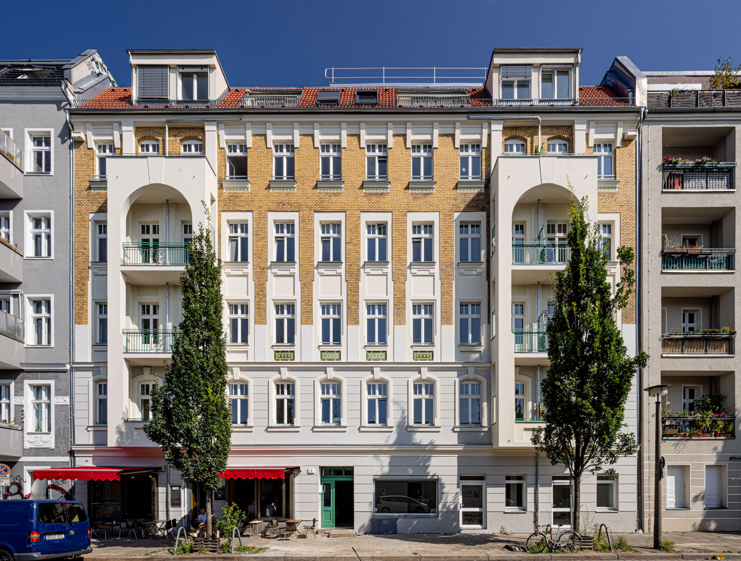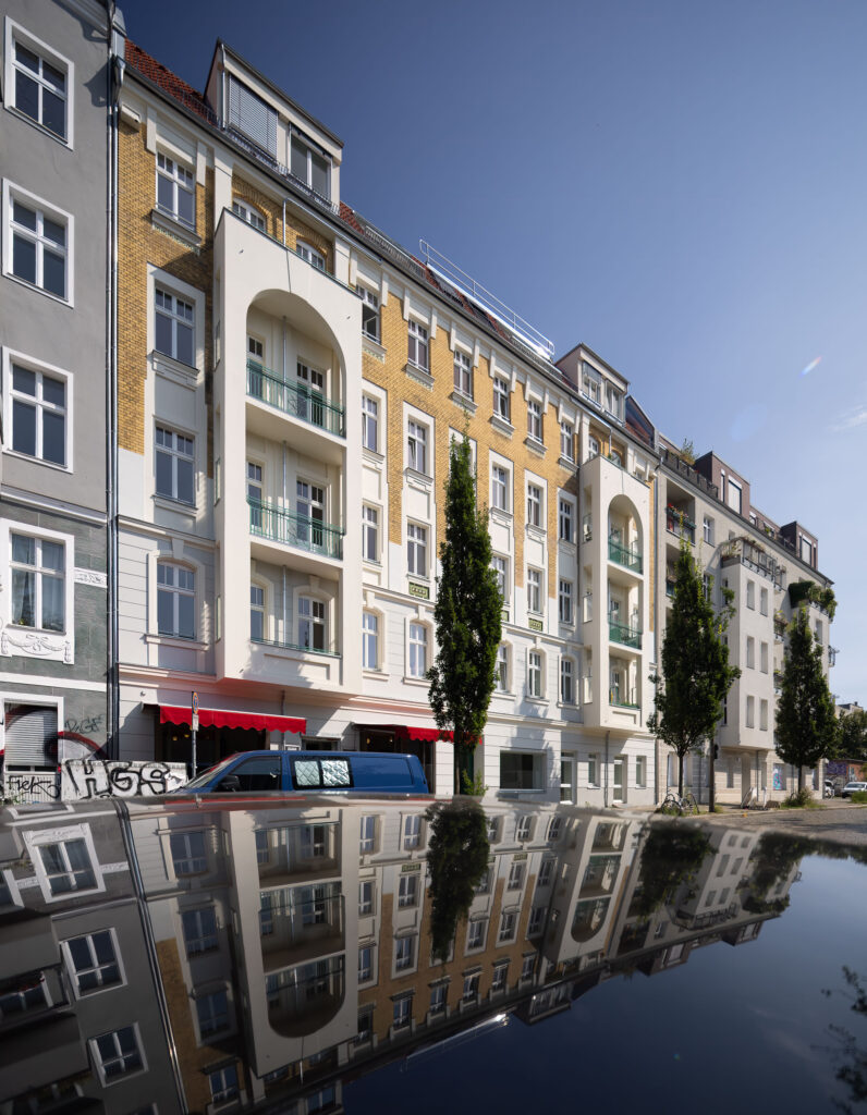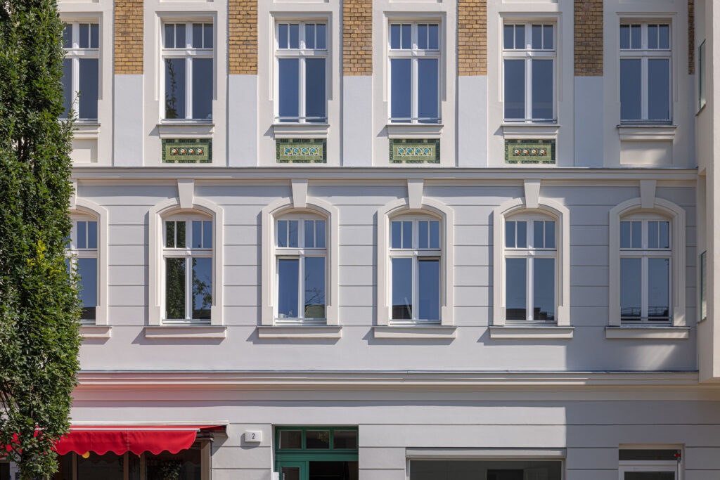Eine besondere Herausforderung des Projekts lag in der exakten Wiederherstellung der denkmalgeschützten Straßenfassade, die höchste handwerkliche Ansprüche an das Material und die historische Genauigkeit der Ausführung stellte. Mit der erfolgreichen Fertigstellung im Mai 2024 erstrahlt die repräsentative Fassade der Seelower Straße 2 nun wieder in ihrem alten Glanz und verbindet moderne Energieeffizienz vorbildlich mit bewahrter Architekturgeschichte.