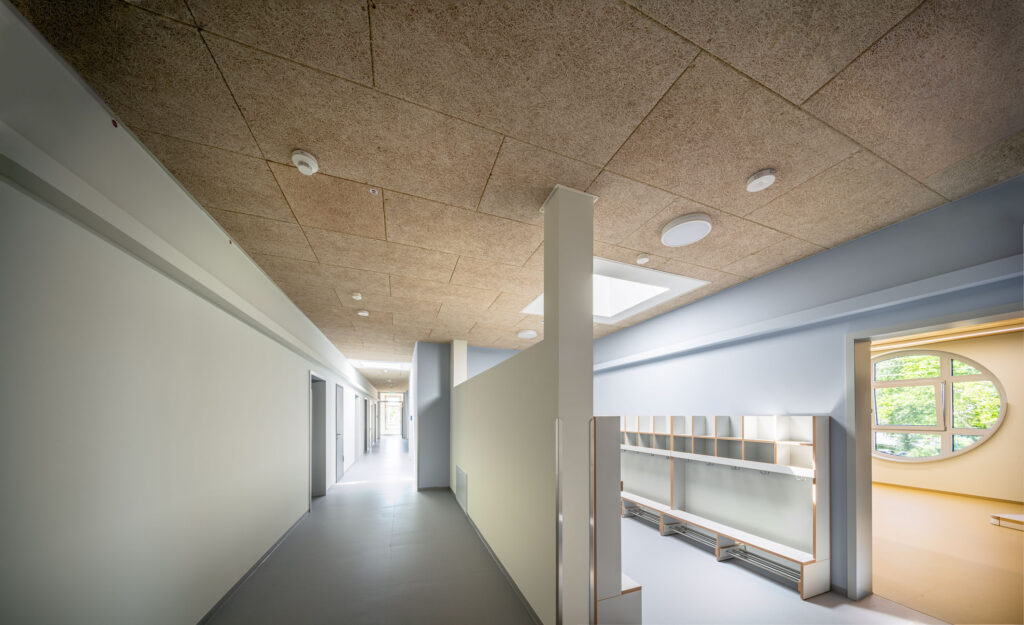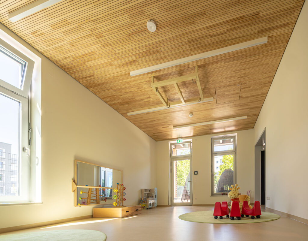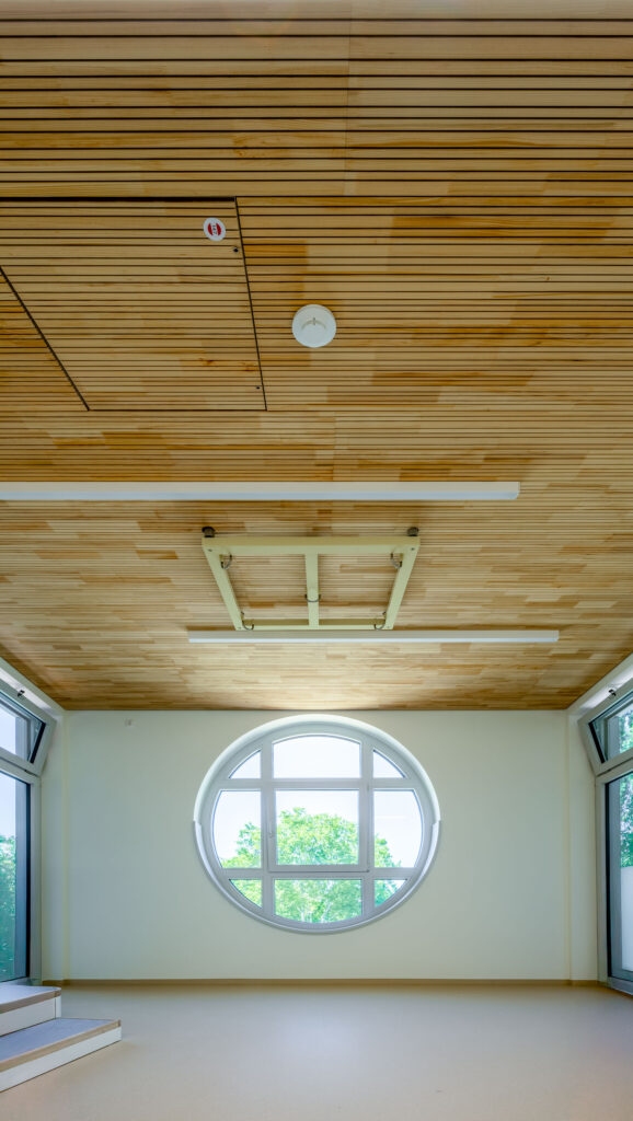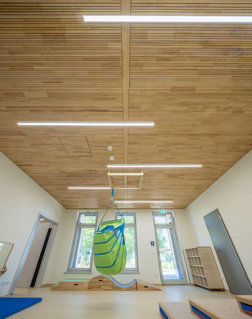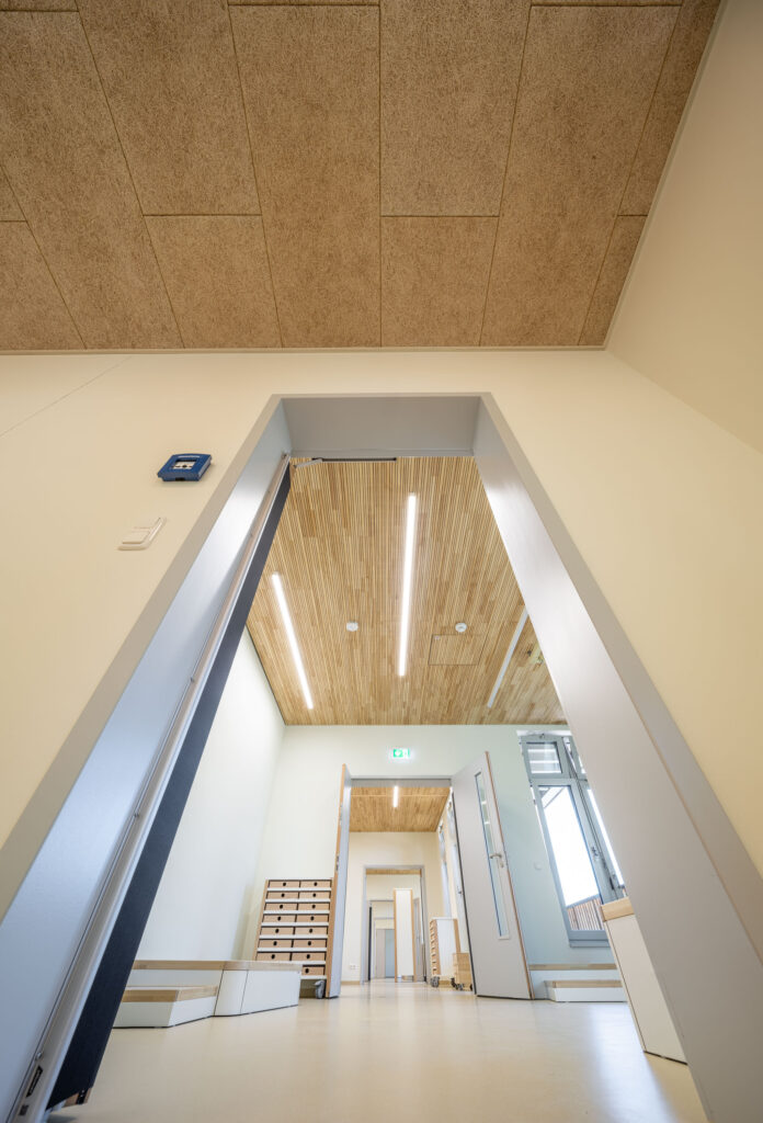 Zu den Kernleistungen des Projekts gehörte die Montage von fast 1.000 m² hochwertigen Akustikpaneelen aus Brettsperrholz und speziellen Holzwolle-Leichtbauplatten. Auch spezifische Anforderungen für Sonderbereiche, wie etwa die Installation von streng reglementierten Hygienedecken mit Mineralplatten im Küchenbereich sowie die optisch ansprechende Integration von Lichtvouten in den Fluren der Kita zählten zum Leistungsumfang.