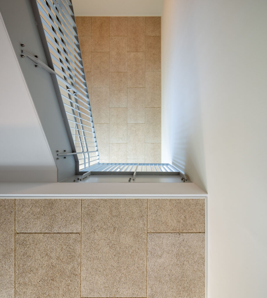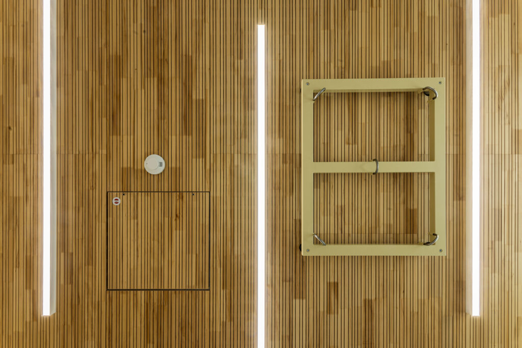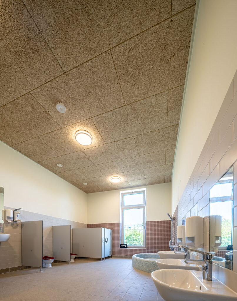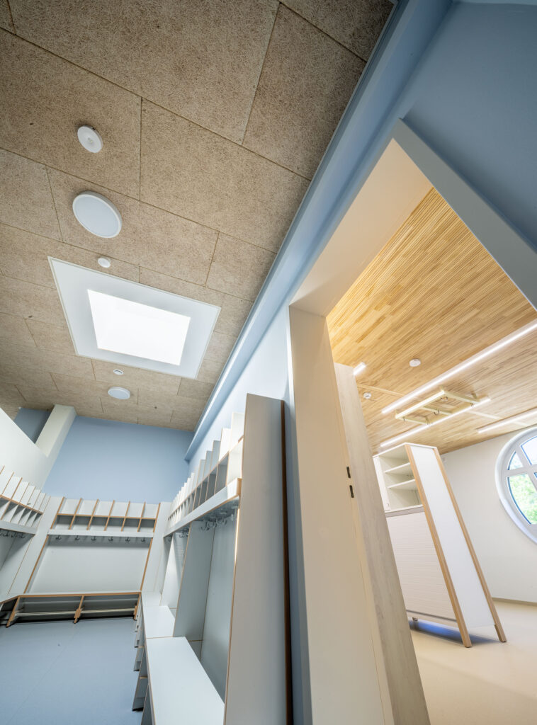 Zu den Kernleistungen des Projekts gehörte die Montage von fast 1.000 m² hochwertigen Akustikpaneelen aus Brettsperrholz und speziellen Holzwolle-Leichtbauplatten. Auch spezifische Anforderungen für Sonderbereiche, wie etwa die Installation von streng reglementierten Hygienedecken mit Mineralplatten im Küchenbereich sowie die optisch ansprechende Integration von Lichtvouten in den Fluren der Kita zählten zum Leistungsumfang.