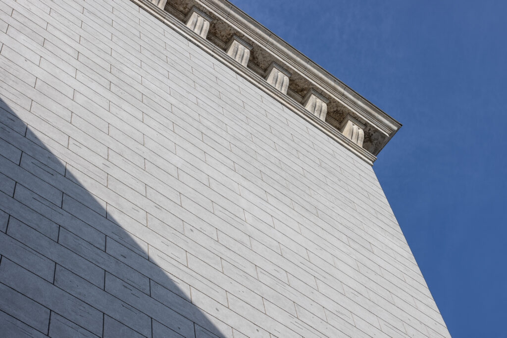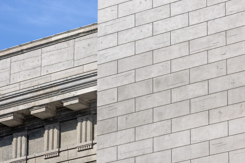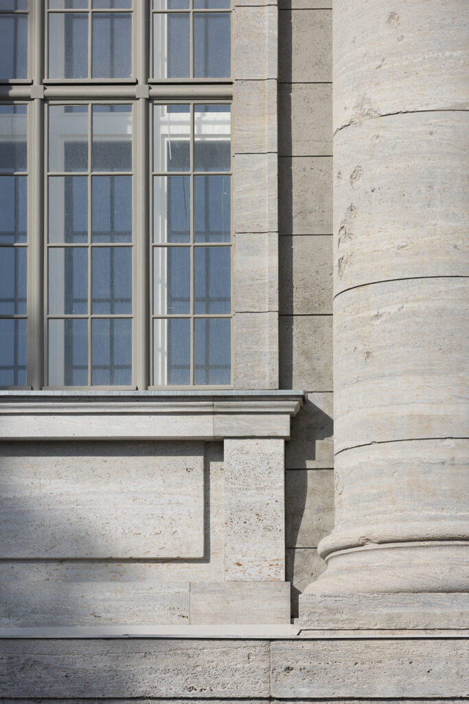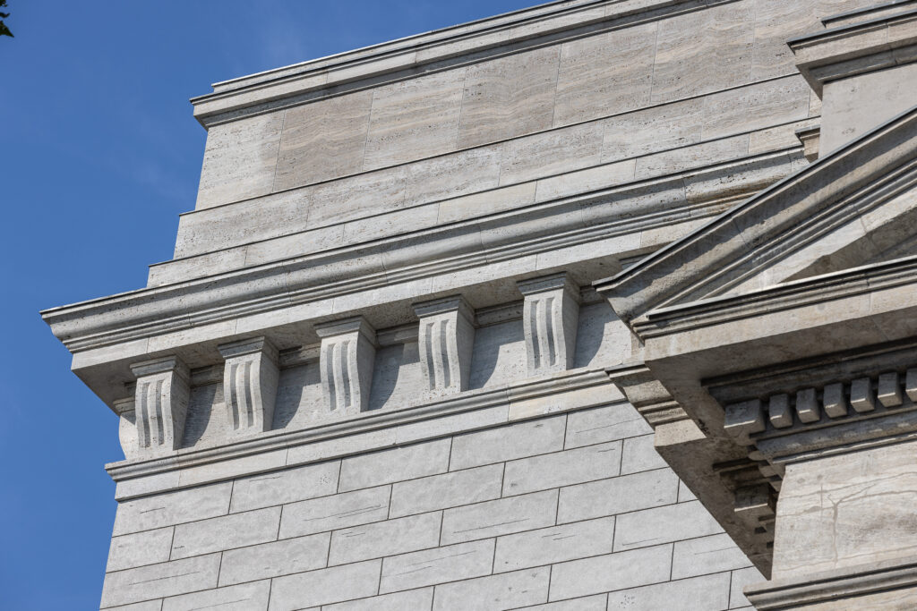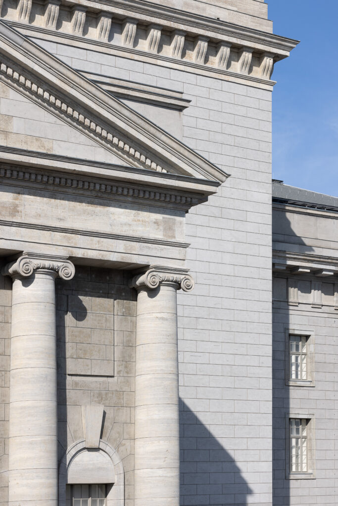 Neben dem behutsamen Putzabbruch und komplexen Mauerwerksarbeiten zählte vor allem die aufwendige Neuentwicklung historischer Putzrezepturen wie dem „Steinputz Neu Dunkel“ zum Leistungsportfolio der K. Rogge Spezialbau GmbH. Zu den besonderen Herausforderungen zählten die Herstellung der Oberflächen als Quaderputz mit geschliffener Oberfläche unter Einarbeitung von Kavernen. Zusätzlich wurden Pilasterkapitelle, Triglyphen und Lisenen fachmännisch restauriert und originalgetreu wiederhergestellt.