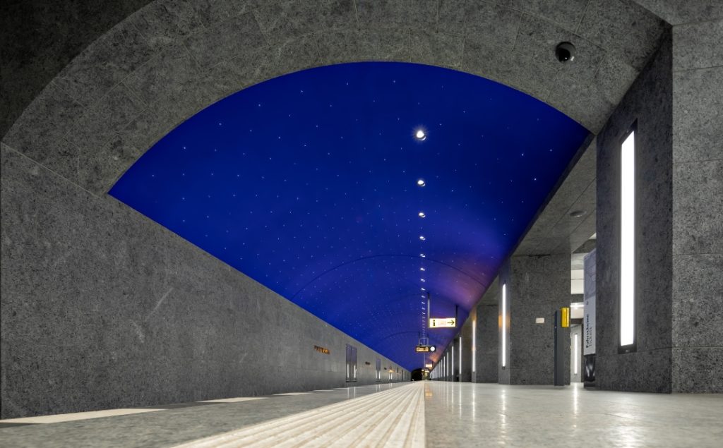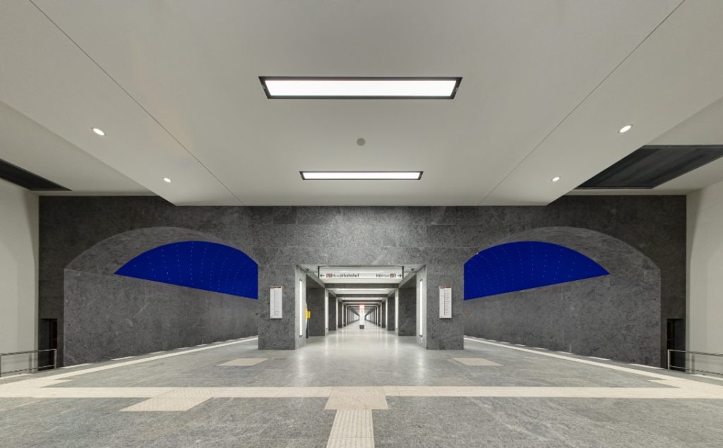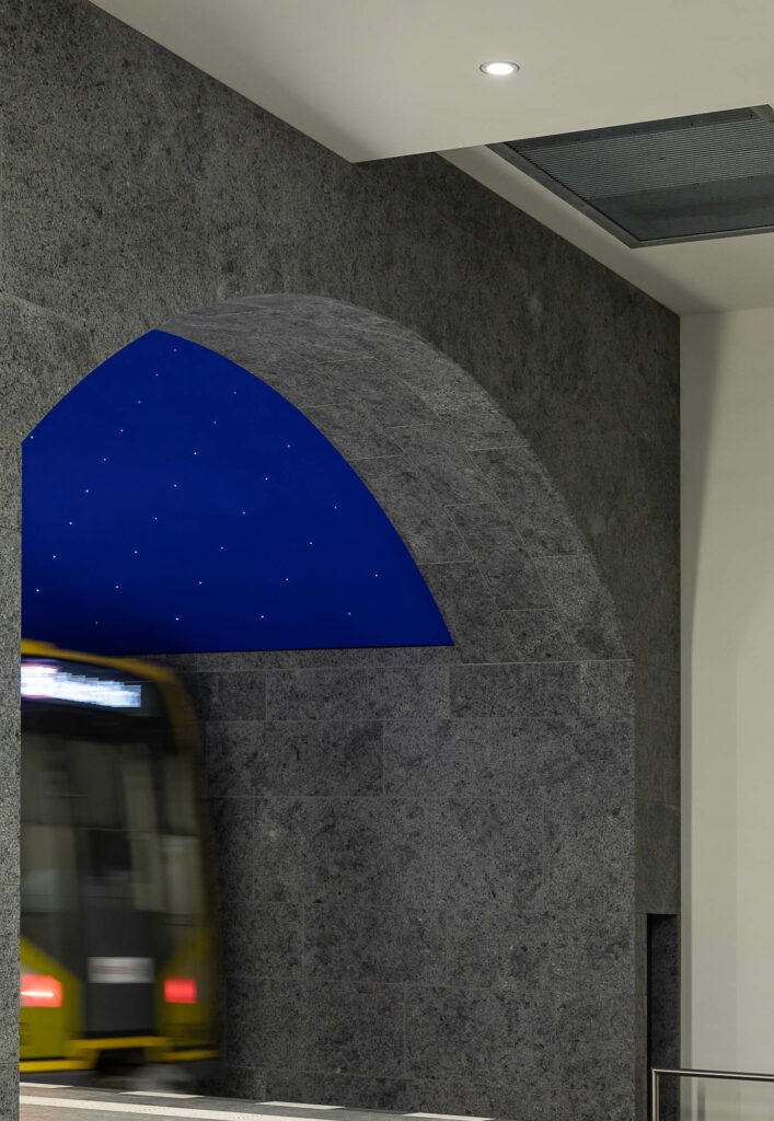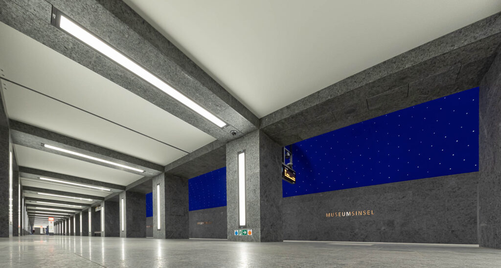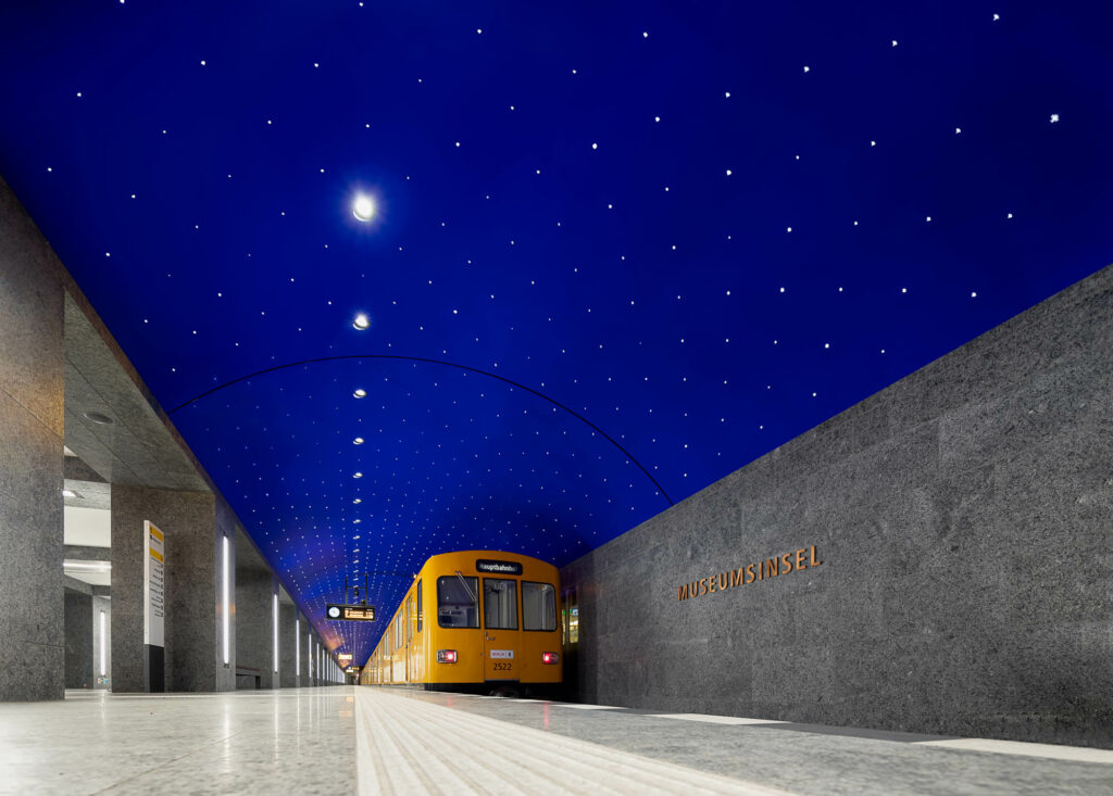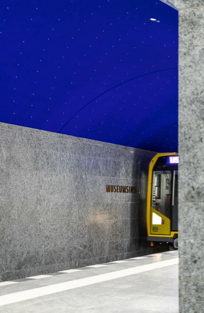 Tief unter dem historischen Herzen Berlins entstand mit dem U-Bahnhof Museumsinsel ein architektonisches Meisterwerk. Als Teil der U-Bahn-Linie U5 verbindet der im Jahr 2021 eröffnete Neubau in rund 16 Metern Tiefe Mobilität mit baukünstlerischer Eleganz. Der Architekt Max Dudler ließ sich für die Gestaltung von Karl Friedrich Schinkels legendärem Bühnenbild für Mozarts Oper „Die Zauberflöte“ inspirieren. Entstanden ist ein magischer Ort, der das Motiv der ewigen Nacht aufgreift.